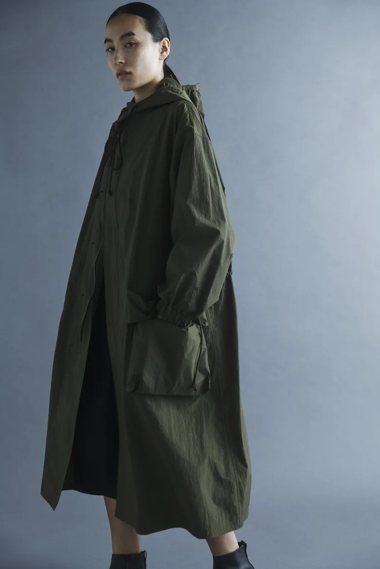 また、立体的なカーゴポケットを配したオーバーサイズのコートとルーズシルエットのパンツも登場。光沢を帯びた生地が深みのある発色を際立たせ、軽さと薄さが動きにニュアンスを与える。限定カラーはカーキで、通常カラーはライトグレー、ピンク、ブラックの3色の展開となっている。