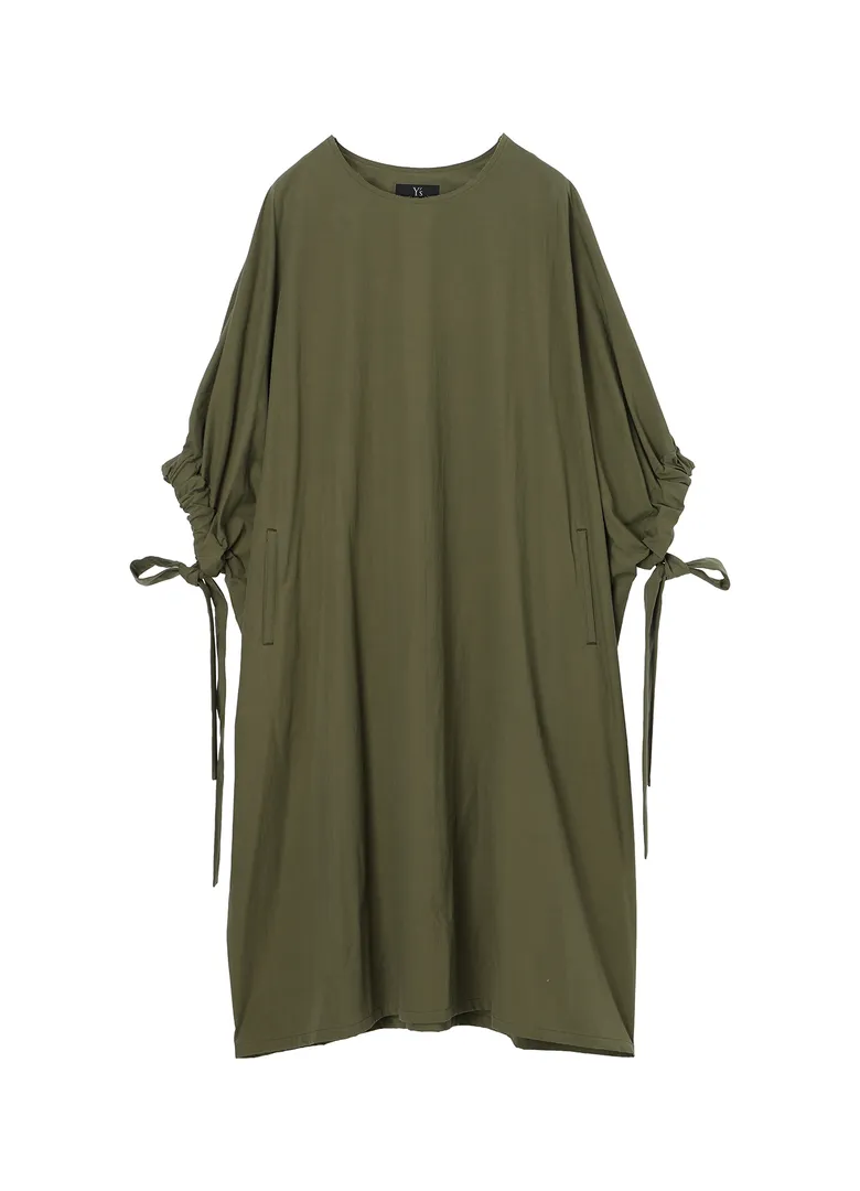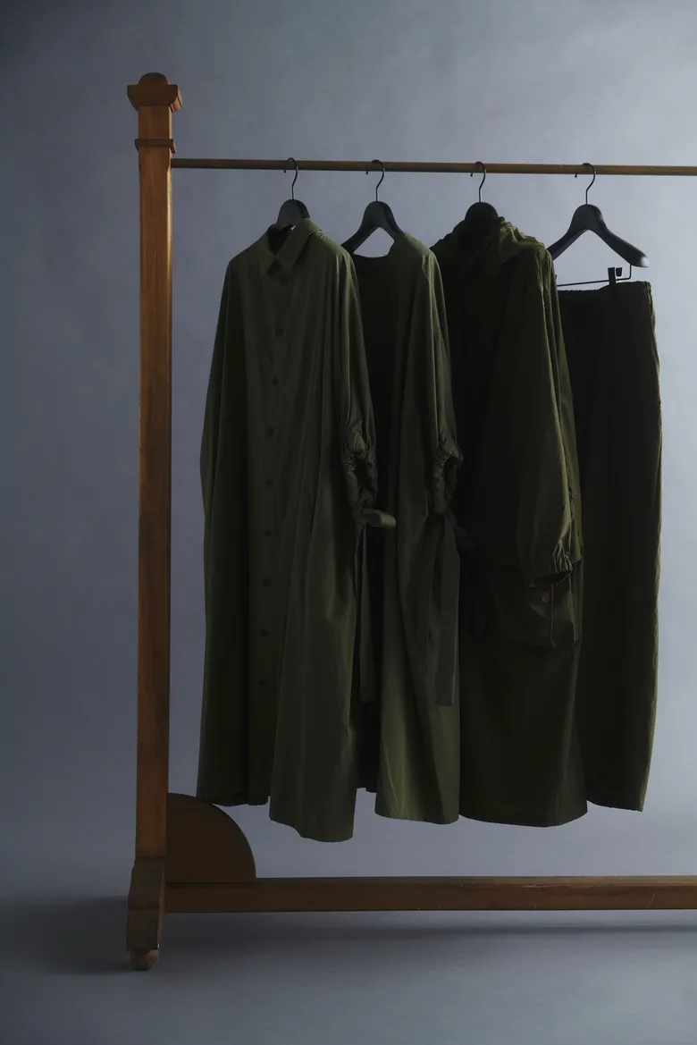 さらに、丸首とシャツドレスの2型で展開するゆったりとしたドレスもラインナップ。袖口に通した紐がさりげないアクセントとなり、結びや取り外しによって表情に変化をもたらす。限定カラーはカーキで、通常カラーはベージュとブラックの2色展開となる。