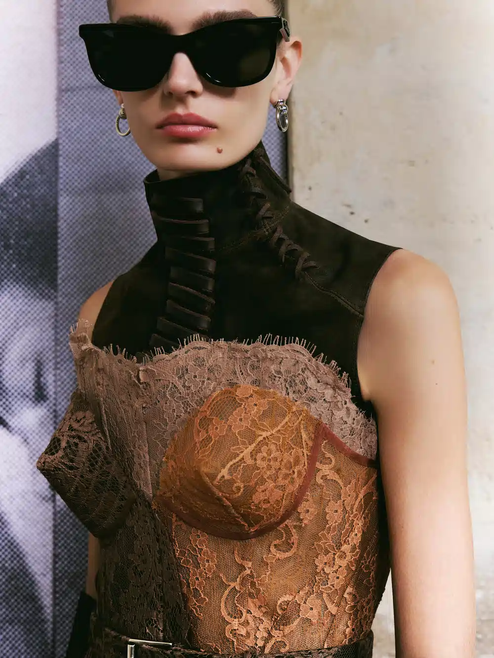一方で、ウィメンズラインでは彫刻的なアセテートフレームが登場。クラシックな日常使いのフォルムを大胆なプロポーションで強調し、ブラックとブラウンゴールドの2色で展開される。これらのデザインは、ランウェイでも発表され注目を集めた。