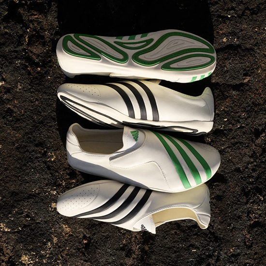 内省的なインスピレーションを基に、ファレル・ウィリアムスの感性で再構築された「FLAT EARTHER」は、ホワイトのフルグレインレザーにグリーンのストライプスを施したモデルと、ブラックのストライプスを施したモデルの2種類で展開される。いずれも無駄を削ぎ落としたミニマルなフォルムでやさしく足を包み込み、優れた柔軟性と通気性を備えている。アッパーにはフルグレインレザーを使用し、しなやかでソフトなフィット感を実現。さらに、レザーライニングによる快適な履き心地に加え、EVAインソールと射出成形アウトソールの組み合わせにより、安定性と、日常使いに適したデザイン性を兼ね備えている。