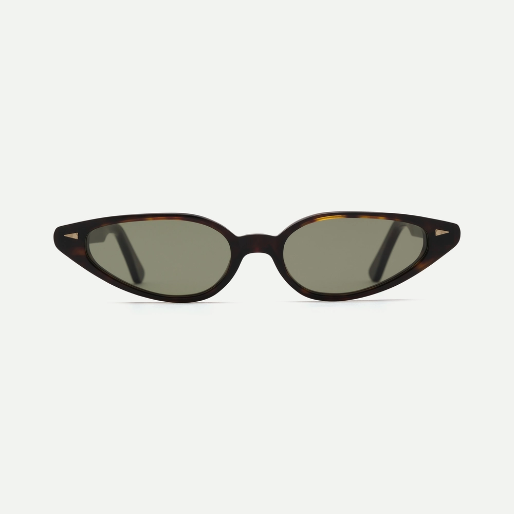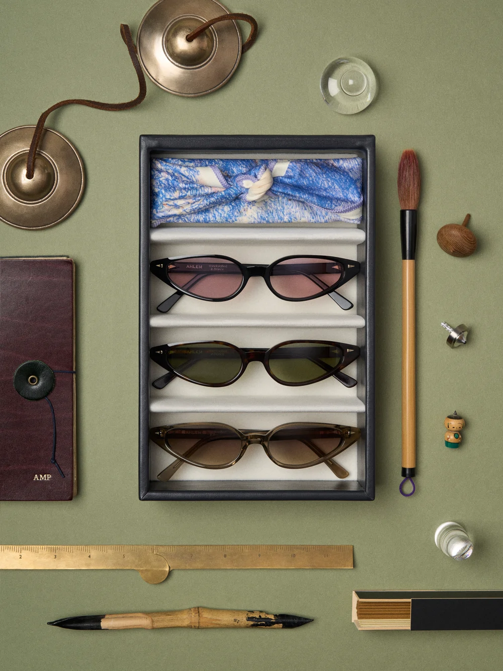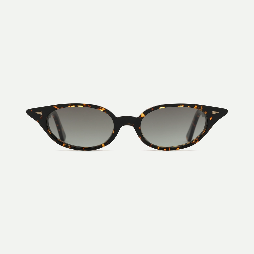 フレームはキャットアイをベースに先端を伸ばした設計が特徴で、外側へ広がる輪郭が顔立ちを引き上げる印象的なシルエットを生み出す。ラインに宿る緊張感がフェミニニティを引き出し、精密で力強い存在感を放つ。すべてのフレームはフランスにて、8mm厚のコットンアセテートが使用され職人の手によって仕上げられている。22Kゴールドの電気メッキパーツやレーザー装飾のワイヤーコアなど、細部にまでクラフツマンシップが反映されている。