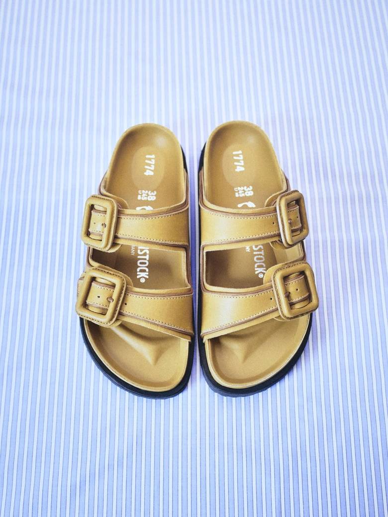 そして3つのアイテムを締めくくるツーストラップサンダルのArizona。マスタードブラウンは全体を同系色で統一した仕上げとなり、ブラックは繊細なパイピングとステッチがシルエットを引き締めることで、お馴染みのクラシックモデルがコレクションのアニバーサリースタイルと見事に調和している。