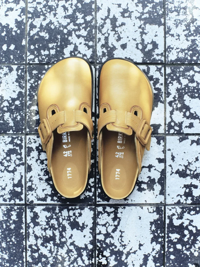 今年はBostonクロッグもまた、節目の年を迎える。1976年に登場したこのモデルは、現在では700以上のシルエットを擁する<BIRKENSTOCK>のアーカイブの一部となった。つま先を包み込む快適さと彫刻的な簡潔さによってブランドを象徴するBostonは、マスタードブラウンとブラックで登場し、その仕立ての美しさと控えめな個性を引き立てるさりげないコントラストディテールが施されている。