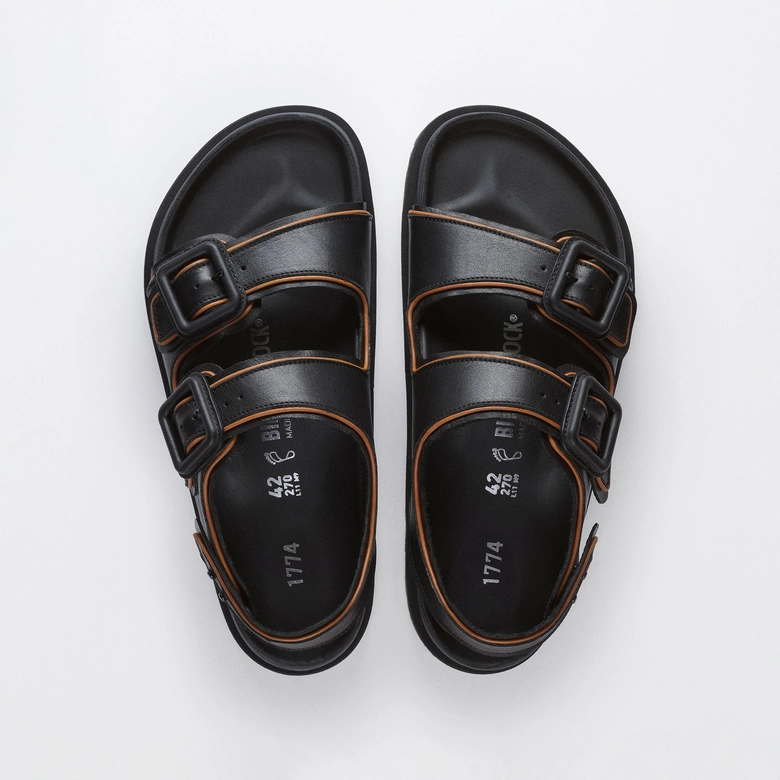 イタリアで調達した素材を用い、ドイツで仕立てられたそれぞれのスタイルには、精緻さと均衡が息づいている。落ち着きを湛えながらも豊かな表情を見せるマスタードブラウンとブラックのパレットが、見慣れたフォルムに奥行きをもたらし、繊細なレザーパイピング、レザーで全面を包んだスクエアバックル、そしてストラップに施された丁寧なステッチといった洗練されたディテールが全体を彩る。その核にあるのは、ブランドの3つコアバリューである機能、品質、そして伝統に根ざし、コレクションの高められたディテールを支える<BIRKENSTOCK>オリジナルのフットベッドである。