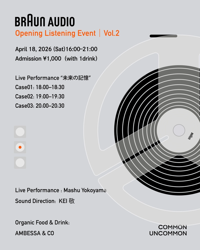 世田谷区経堂のCOMMON UNCOMMON Galleryにて、BRAUN Audioにフォーカスした展示販売イベント「BRAUN Audio The Form of Quiet Vol.2」が2026年4月19日(日)から5月6日(水)に開催される。