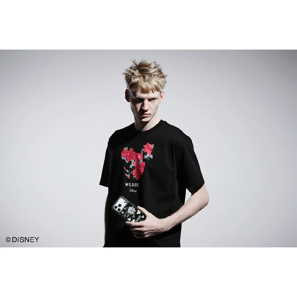 コレクションは、ディズニーの「ミッキーマウス」と<WILDSIDE YOHJI YAMAMOTO>のシグネチャーである「薔薇」がテーマとなっており、スマートフォンケースやテックアクセサリーの他にも、Tシャツやフーディー、キャップなど、一部地域限定販売のファッションアイテムも展開される。