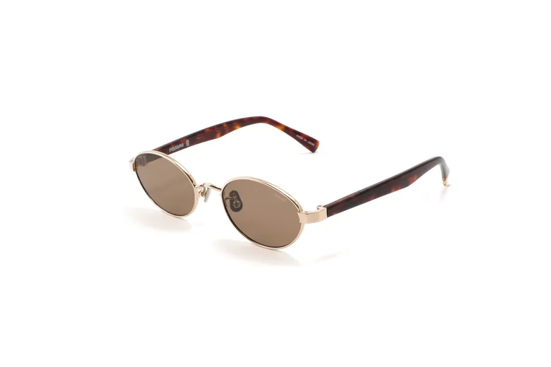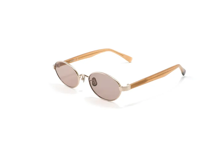 フロントには柔らかなシャンパンゴールドのメタルを、テンプルにはヘーゼルカラーのアセテートを採用。肌に自然に馴染みながら、さりげないモード感を引き出す。上品で軽やかな印象のカラーリング