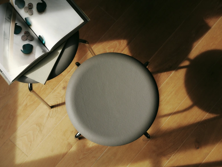 エッセンシャルレザーは、日常の手入れがしやすく、使用頻度の高い家具にも適した素材だ。ミニマルなデザインの「ドットスツール」は、住まいやオフィスでのメインチェアとしてはもちろん、来客時のサブチェアとしても使える。