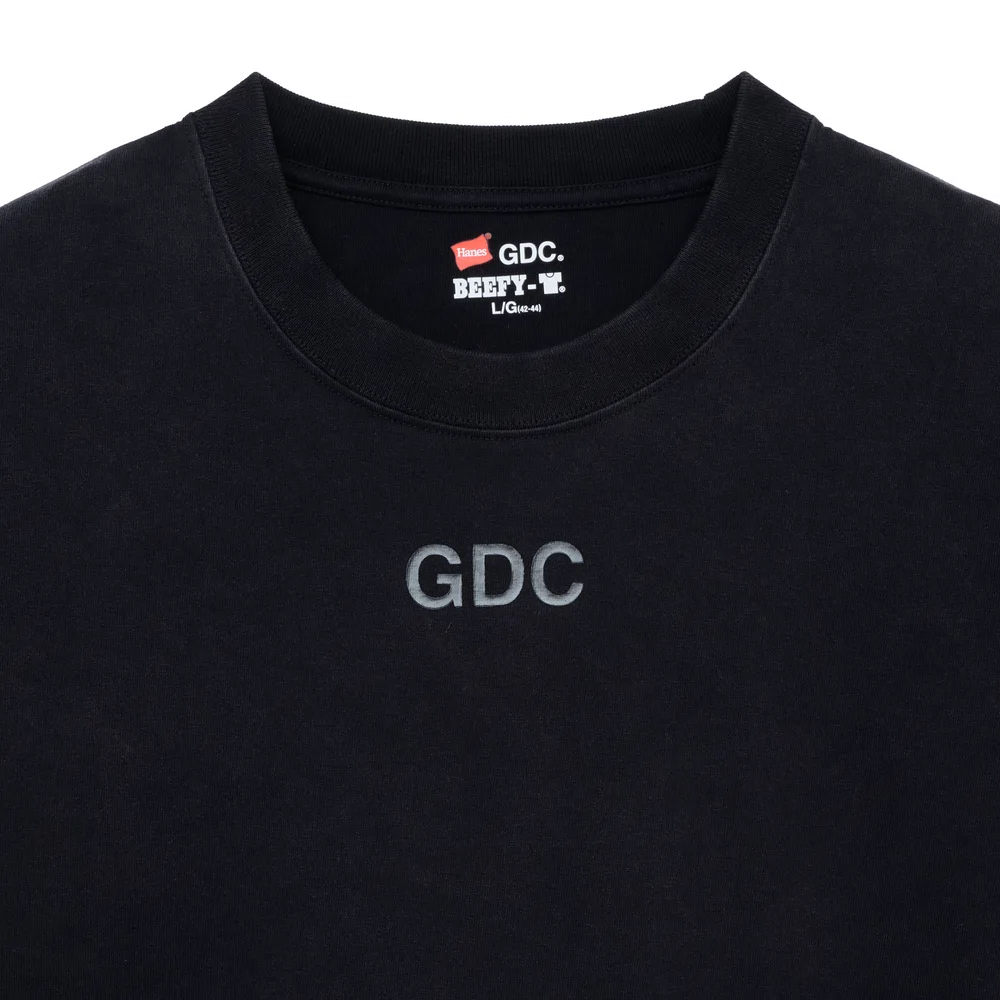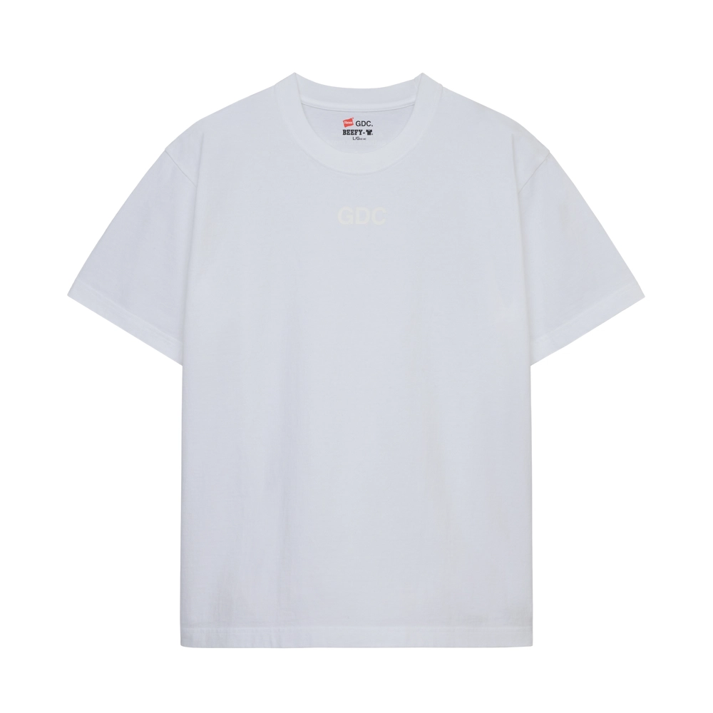 今回のモデルは、1975年に誕生した定番「BEEFY-T®」をベースに採用。コットン100%のタフなボディや丸胴編みによる快適な着心地、タグレス仕様といった特徴をそのままに、<GDC>独自のデザインを加えている。