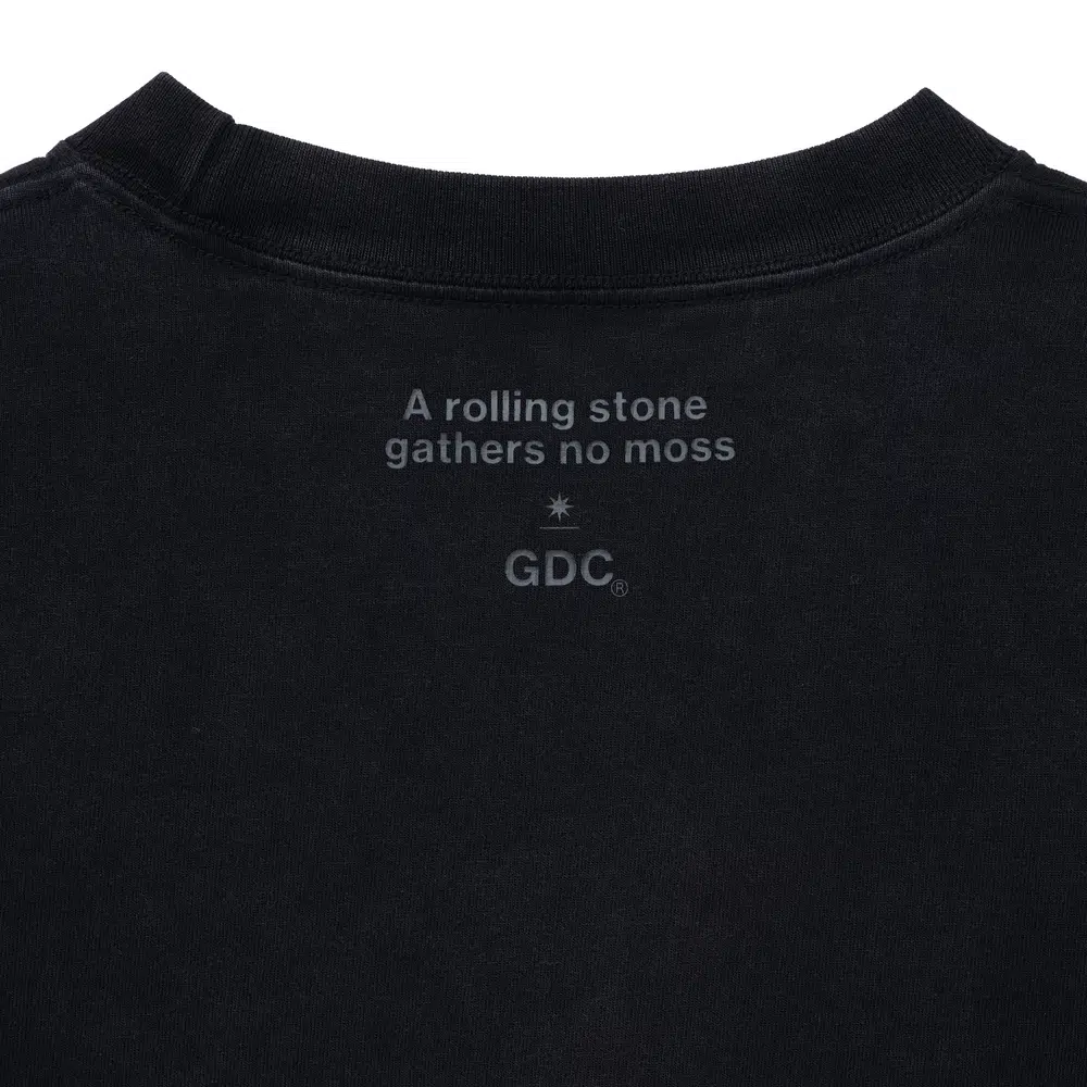 フロントには<GDC>ロゴ、バックネックには“A rolling stone gathers no moss”のメッセージを配置。ホワイトとブラックの2枚組仕様で、パウダーブリーチ加工により着用と洗いを重ねるごとにヴィンテージのような風合いへと変化する。