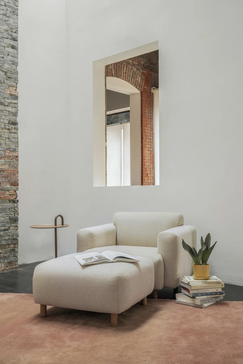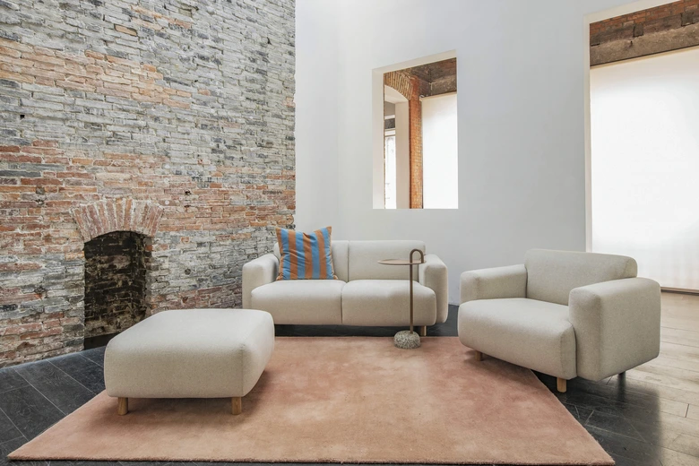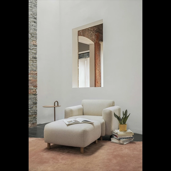 張地は複数のファブリックバリエーションから選択可能。脚部はオーク、コバルトブルー、オレンジ、ブラックの4色を用意し、カラフルな木製脚がアクセントとなり軽やかな印象を演出する。クッションには高密度かつ耐久性に優れたフォームを使用し、快適性と長期使用に適した品質を両立。Ottomanはソファと組み合わせても単体でも設置可能で、ライフスタイルやレイアウトに応じて柔軟に使用できる。