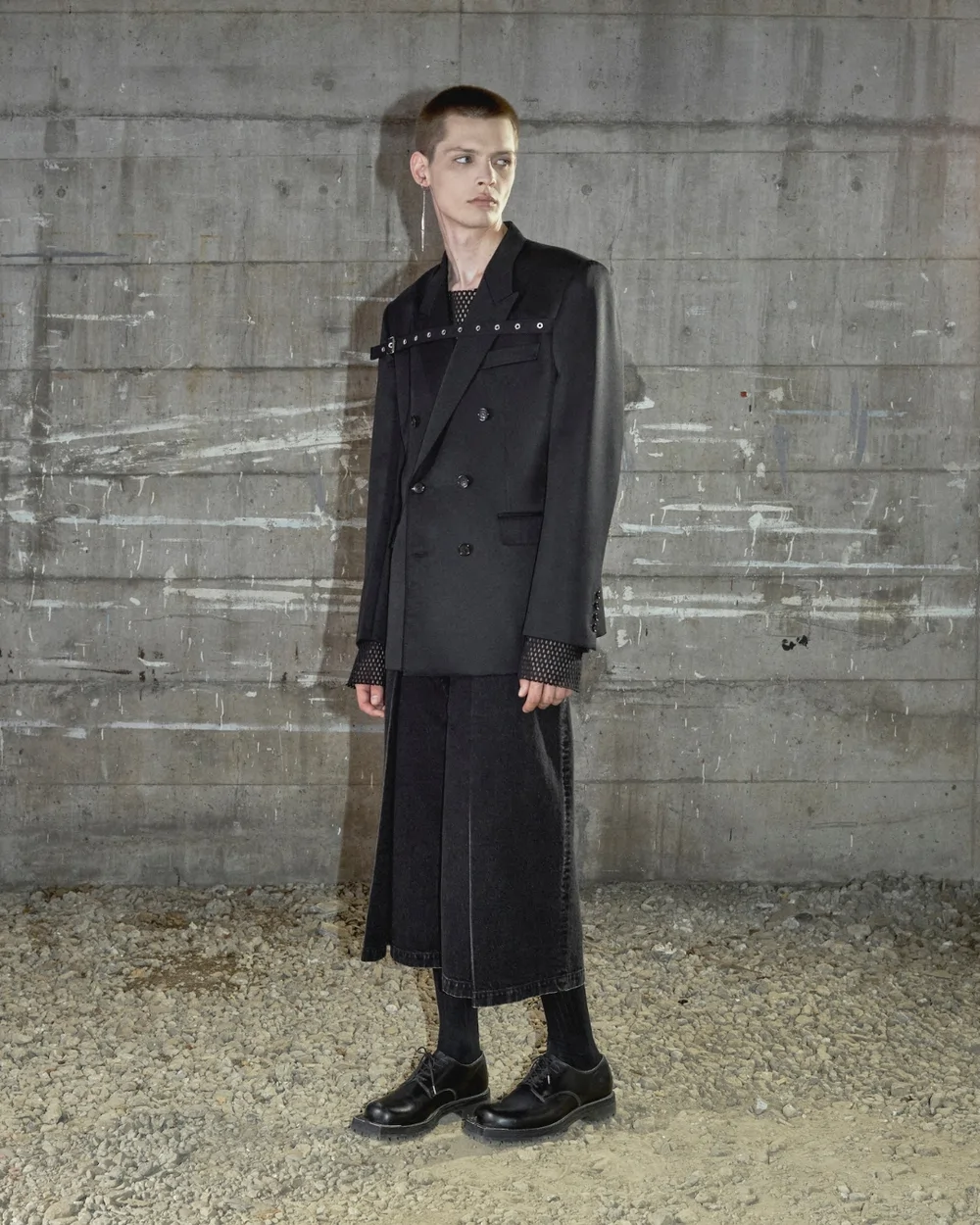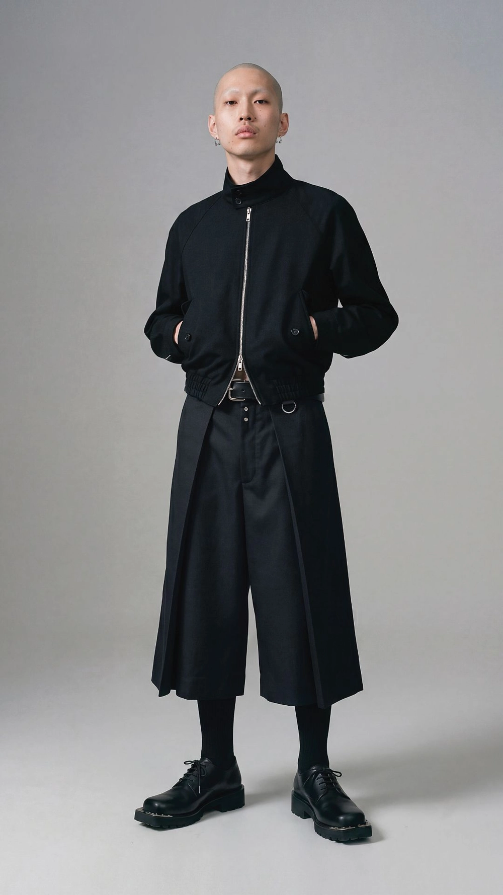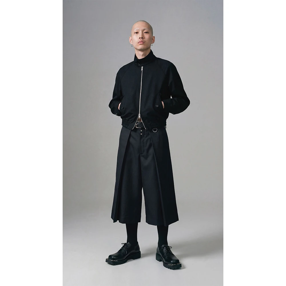 本アイテムは袴を想起させる深いインタックを軸に、フロントへ分量を集約することで立体的なフォルムを形成。裾にかけて広がるワイドシルエットが静かな迫力を持って存在感を引き立て、動きに合わせて生まれる揺らぎと陰影がシルエットに奥行きを与え、静と動のコントラストを際立たせる。