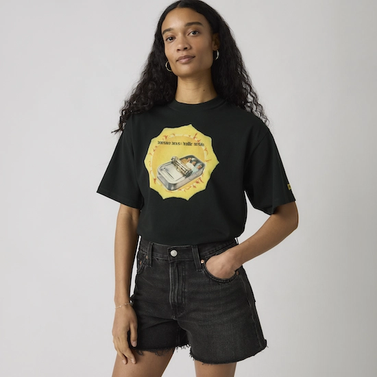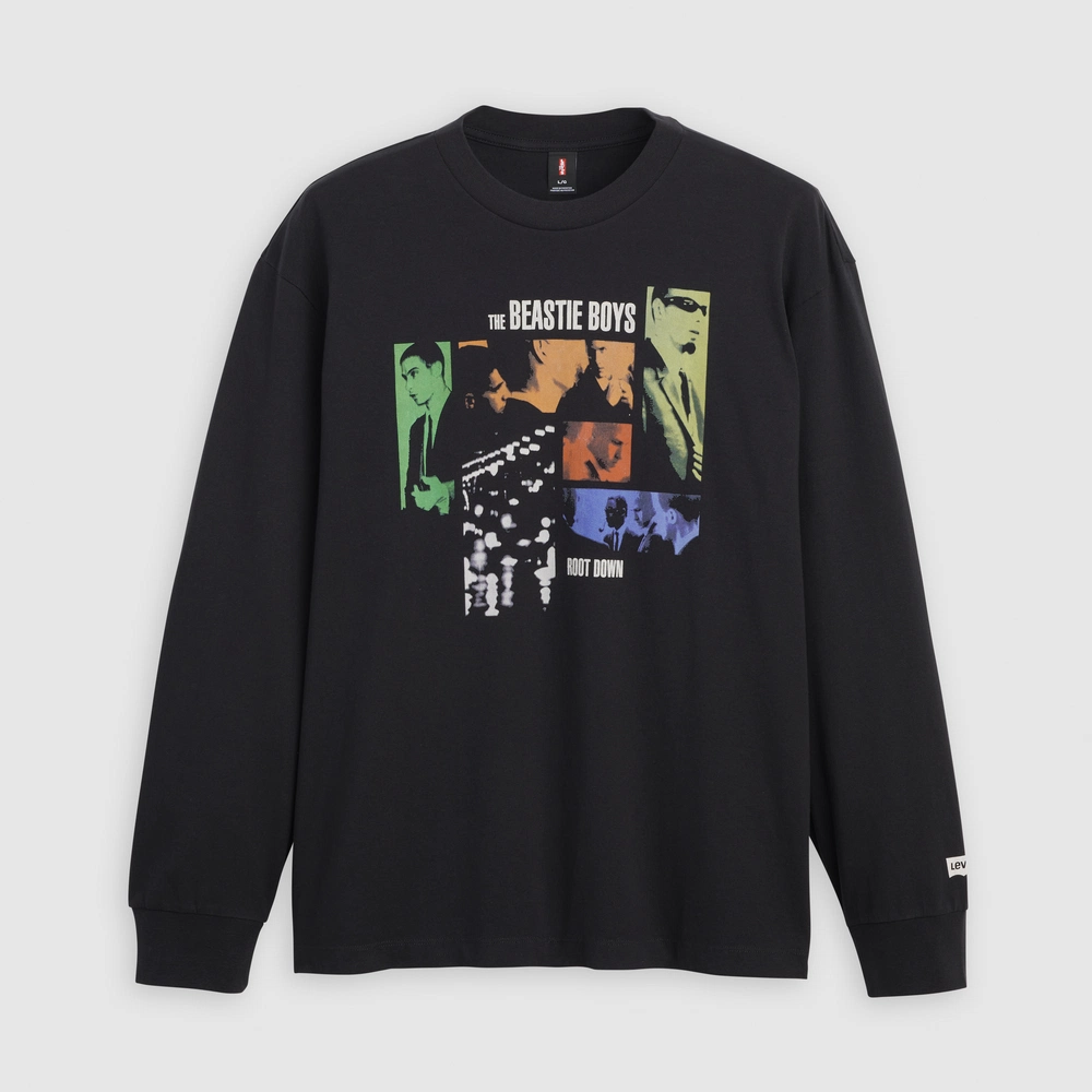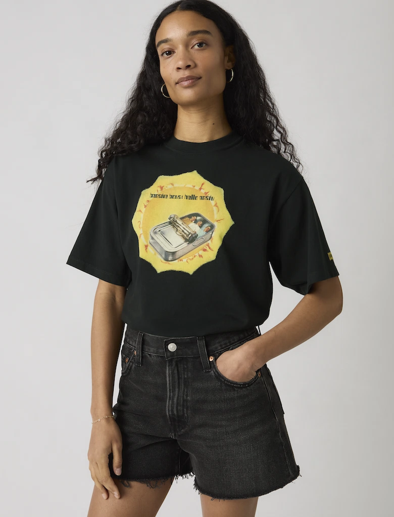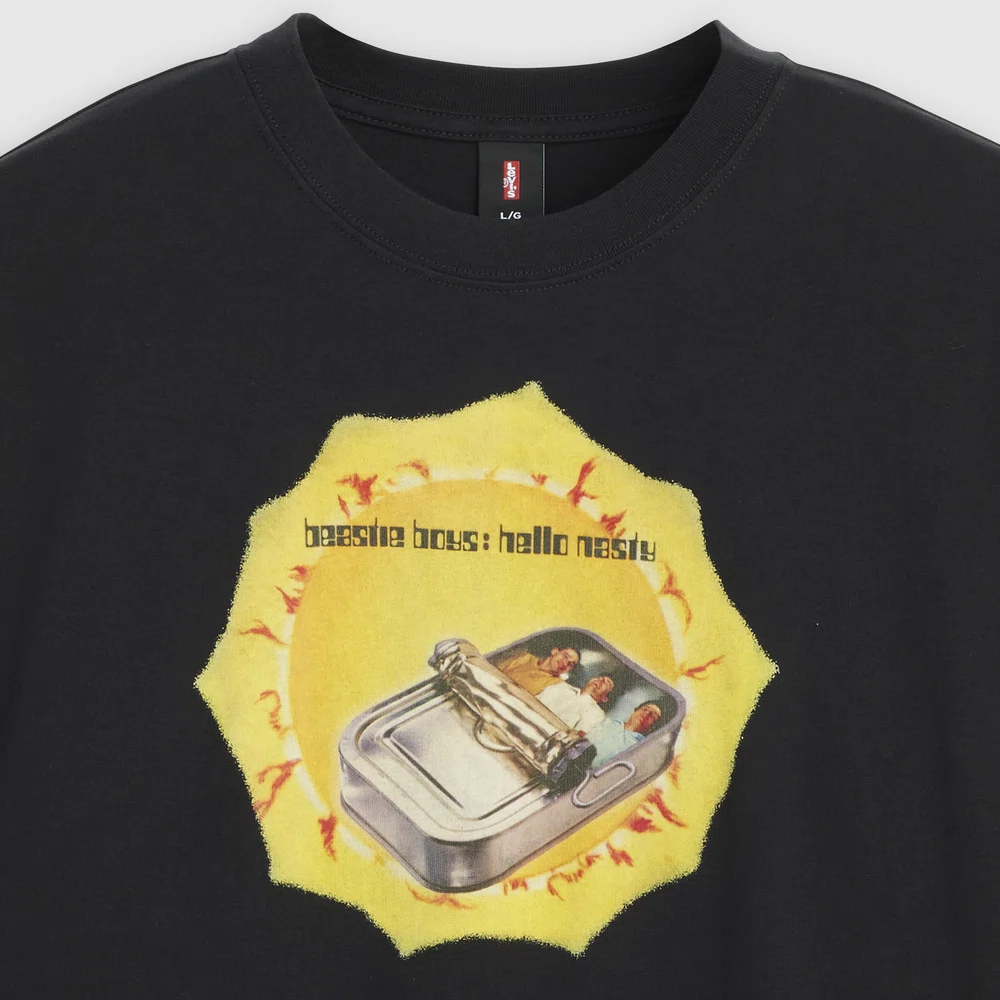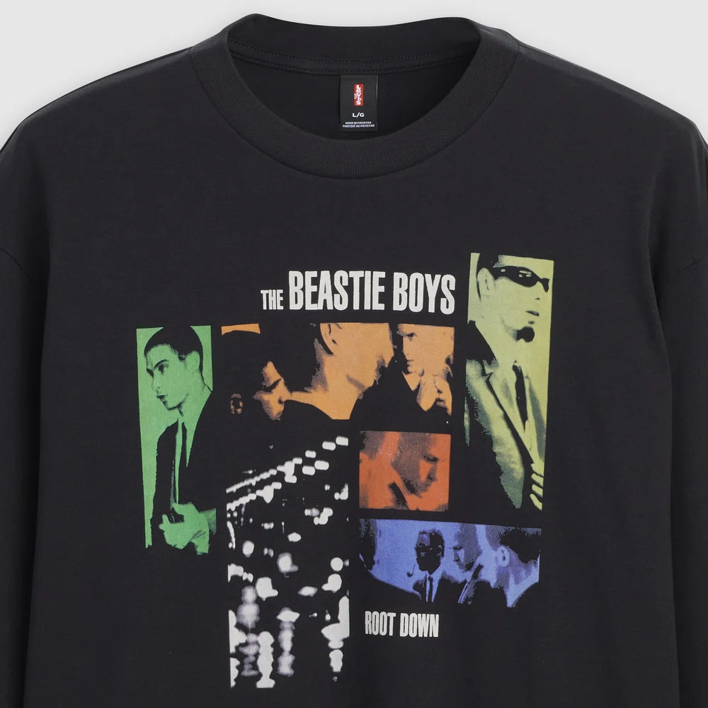 本コレクションは、1981年にニューヨークで結成されたBeastie Boysの初期キャリアやカルチャー的影響を背景に制作されたもので、ヒップホップを軸にロックやパンクなど多様な音楽性を融合してきた彼らのスピリットを、グラフィックTシャツとして表現している。ラインナップは全4型で、アルバム『Hello Nasty』やEP『Root Down』のアートワーク、初期ロゴなどを取り入れたデザインが特徴。ヴィンテージTシャツに着想を得た仕様に加え、1990年代の<Levi’s>のブランディングを再現した織りネームやカスタムハングタグを採用することで、コレクタブルな価値も高めている。