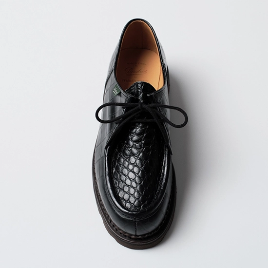 本コラボレーションでは、<Paraboot>のアイコニックなMichaelシルエットに、プレミアムなクロコダイルエフェクトレザーを採用。ブラックのカウレザーをベースにアッパー全体へ型押しを施し、視覚的な奥行きと存在感を付与している。内部にはシープライニングを使用し、快適性と高級感を両立した仕様となっている。