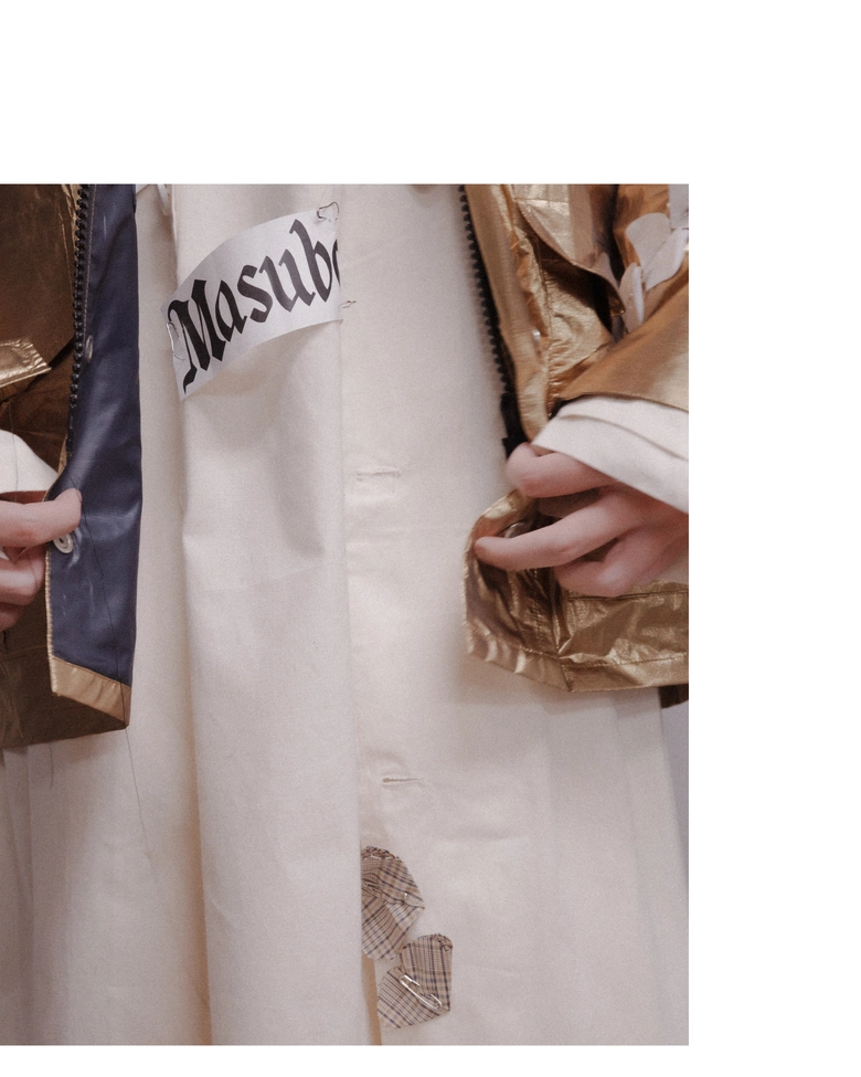 また、イメージヴィジュアルは、デザイナーのInstagramを通じて募集され、多くの応募の中から選ばれた10名のモデルを起用し、写真家の本村和平により<MASU>のアトリエにて撮り下ろされた。制作の過程をひらき、その手前にある思考や時間を共有しようとする本企画の姿勢は、こうしたヴィジュアルの成立ちのあり方にも反映されている。周囲の人々を迎え入れながら、かたちを立ち上げていくそのプロセスには、本企画において提示される「服をつくる過程の楽しさ」という視点が表れている。