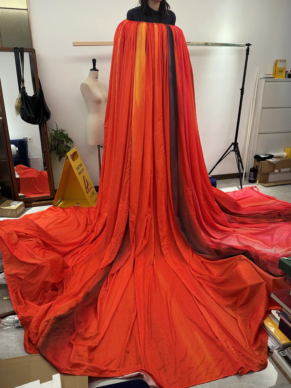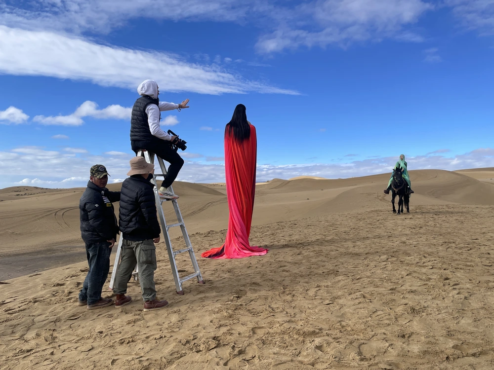 また、砂漠の中で「大地の母」を2メートル以上高く見せたいというKinの意向から、2メートルを超える身体をすっぽり覆う大きな赤いマントを制作。結果として、その優美な存在感が砂漠の景色と調和し、すべてを超越するかのような「大地の母」のイメージがより印象的に描かれている。