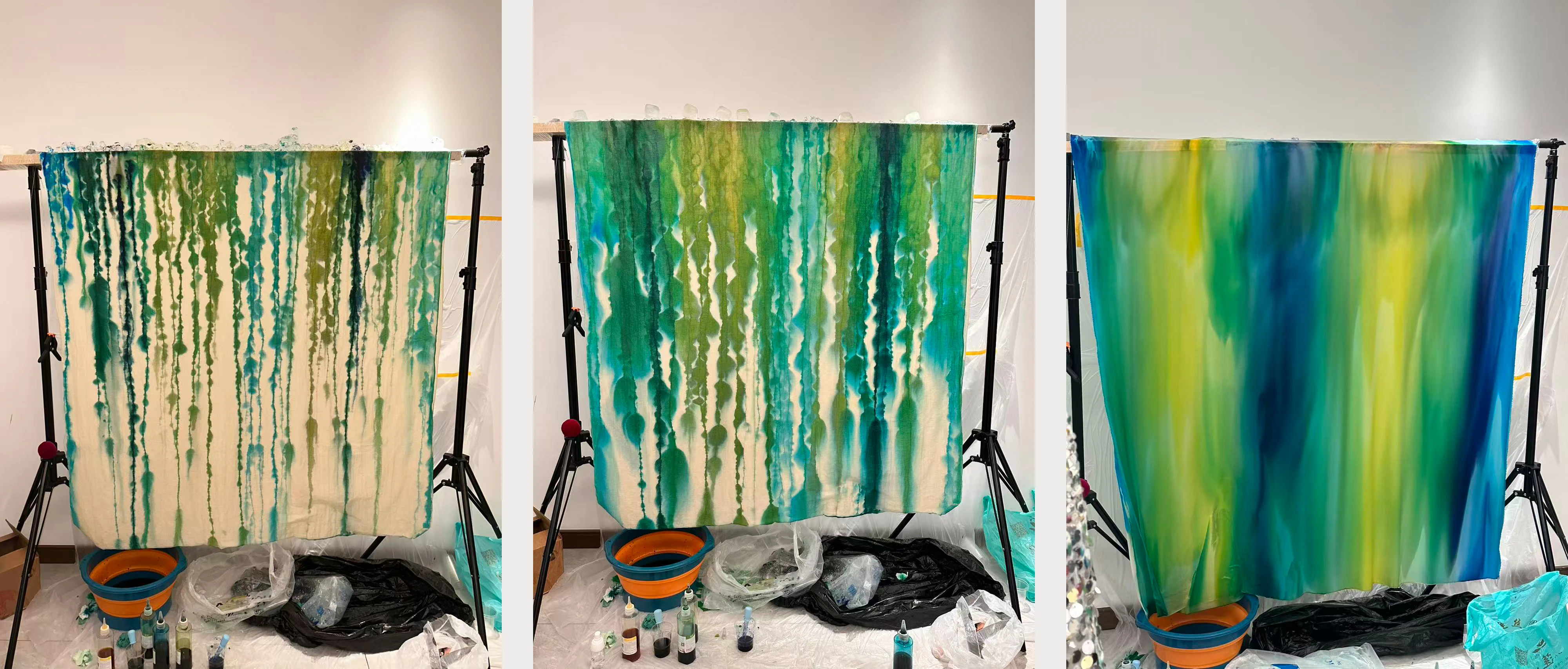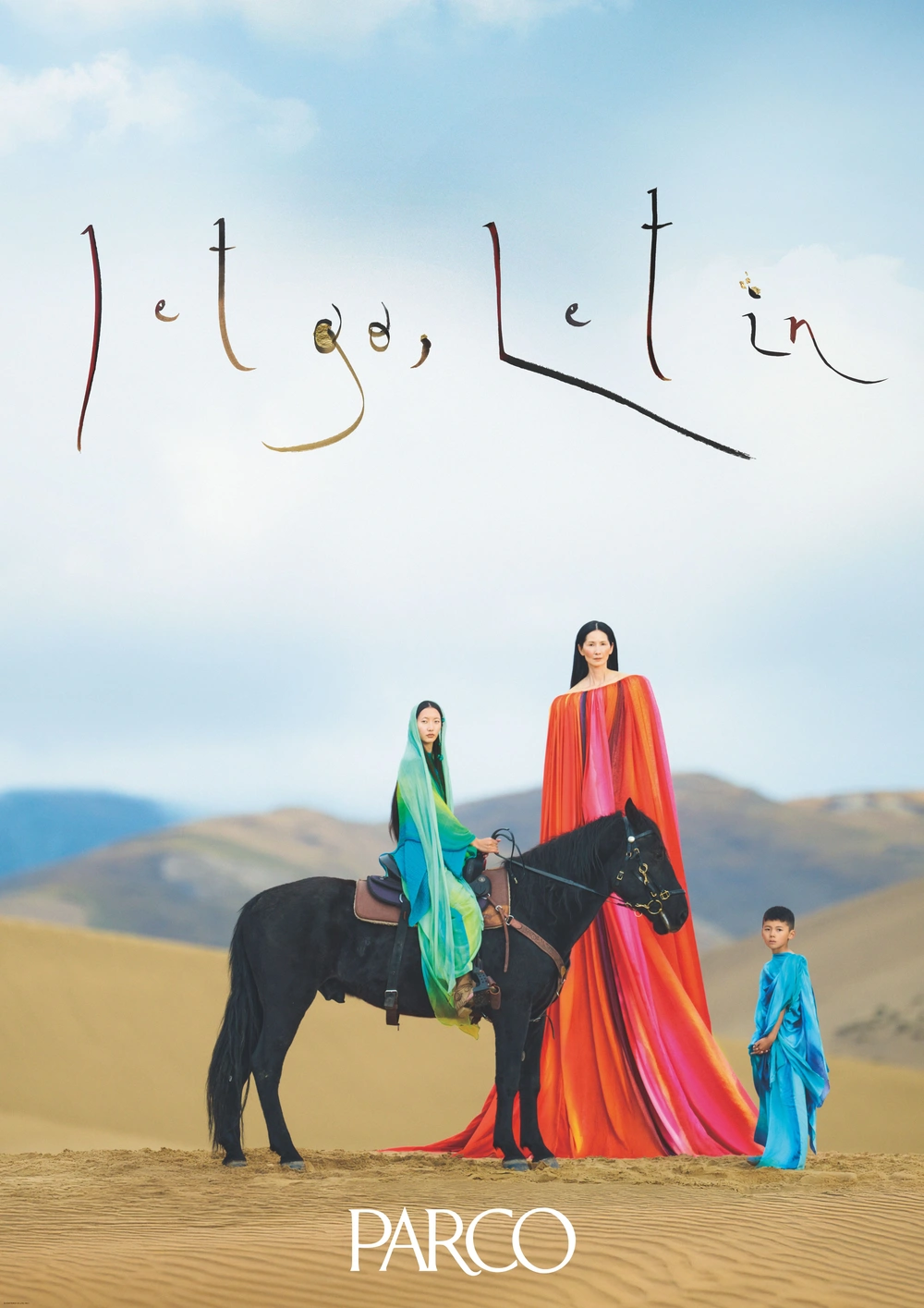 衣装はZipeng Liが“Let go, Let in”のストーリーイメージに合わせて制作したオリジナル。各登場人物のイメージに応じて染色した軽やかなシルク生地を用い、手染めならではの風合いによって雄大な自然に溶け込むグラデーションに仕上げられている。