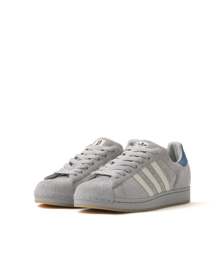 カラーは、深みのあるDGH SOLID GREYと、都会的で研ぎ澄まされた印象のCLEAR ONIXの2色展開。いずれも異なる表情を持ちながら、スタイリングを選ばず、足元に確かな存在感をもたらす。アッパーには、全体を包み込むように上質なスエード素材を採用。アイコニックなシェルトゥに至るまで同素材で仕上げることで、SUPERSTARの象徴的なフォルムに新たな質感と奥行きを添えている。ディテールにも、常田大希氏の美意識が随所に反映されている。シュータン裏には本人のサイン刺繍を施し、取り外し可能な2種類のロングシュータン(同色仕様/ヒール部に配色アクセントを加えた仕様)を付属。着用者の感性に応じたアレンジを可能にしている。さらに、サイドには通常の「SUPERSTAR」ロゴに代えて、「POINTLESS JOURNEY」の刻印を採用。付属品として、2組のシューレースとカスタマイズ用のメタル製シュータングラフィックピン(2種)を同梱。細部に至るまで、着用者自身が完成させることを前提に設計された一足となっている。
