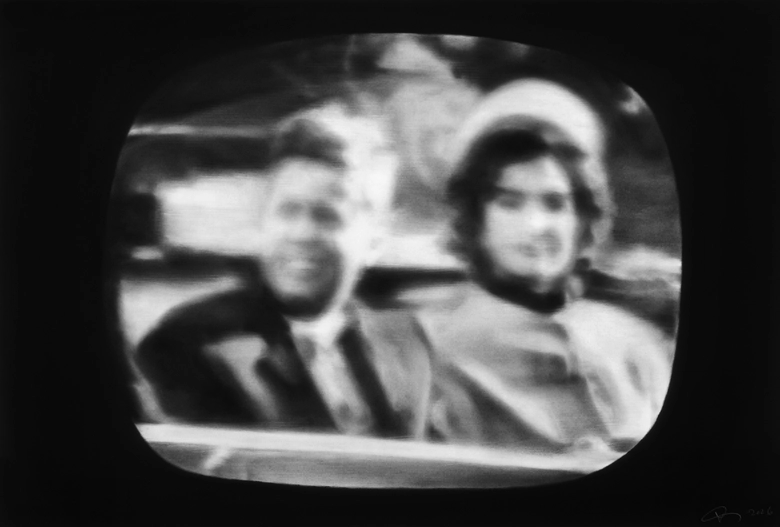 Robert Longo Untitled (JFK & Jackie, Zapruder Still), 2026 WORK ON PAPER charcoal on mounted paper 28" × 42" (71.1 cm × 106.7 cm), image 33" × 47" × 3-9/16" (83.8 cm × 119.4 cm × 9 cm), frame © 2026 Robert Longo/Artists Rights Society (ARS), New York.