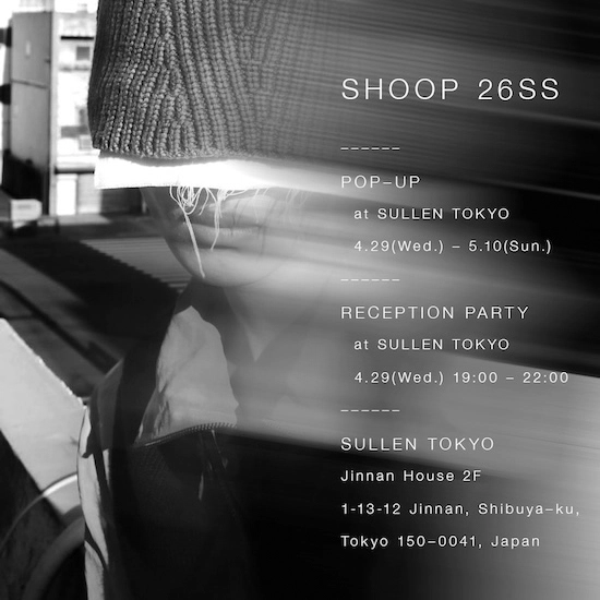 会場となる「SULLEN Tokyo」は、東京におけるコンテンポラリーファッションとカルチャーをつなぐ拠点のひとつとして知られている。また、初日となる4月29日には、19時から22時までレセプションパーティーを開催。デザイナーの大木葉平に加え、ROSEやkC、SULLENスタッフによるDJプレイが予定されている。
