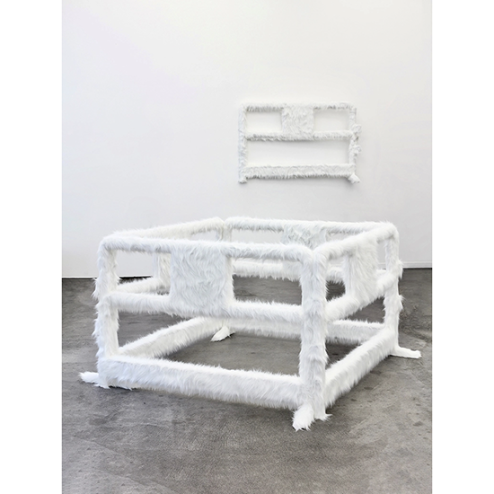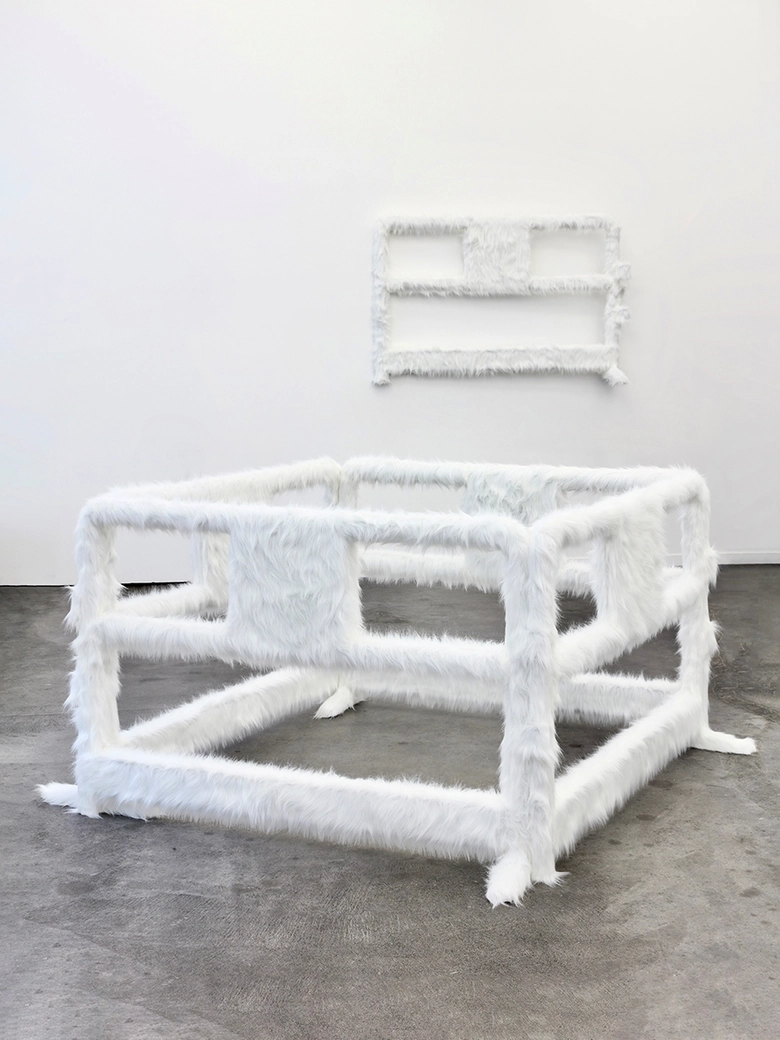 Back: Martin Margiela, “BARRIER Mural (white)”, 2024, polypropylene, synthetic fur, 100 x 150 x 30 cm