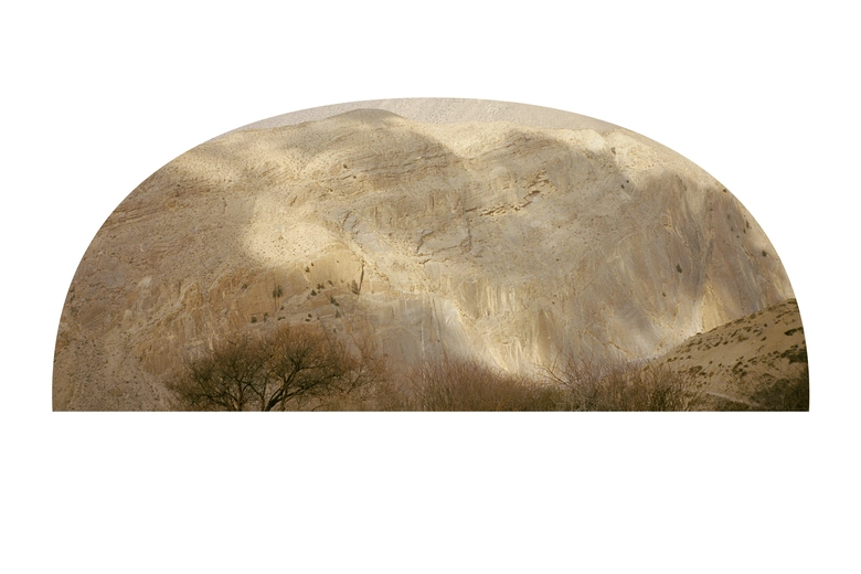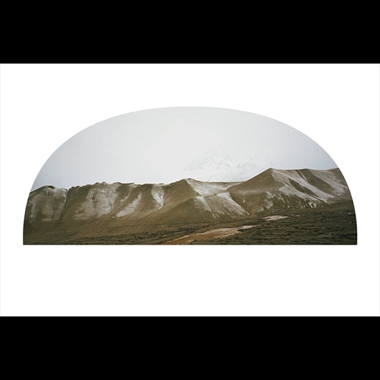 『LO』シリーズのランドスケープ作品は、特徴的な半円形のフレーミングによって構成されている。この形状は、「風景に四つ角は必要か」という問いから始まったものだと津田は語る。その後、ネパールの現地や帰国後まで感じていたある種の「浮遊感」が、「キューポラ」を思わせる眺めへとつながり、半円のランドスケープが生まれた。視界の上部が庇で遮られているかのようなこの視覚表現は、風景とそれに対峙する者のあいだにある距離や関係性をあらためて意識させるものでもある。ネパールの地で古代の人々が洞窟の穴から風景を眺めた体験にも、どこか通じるものがある。