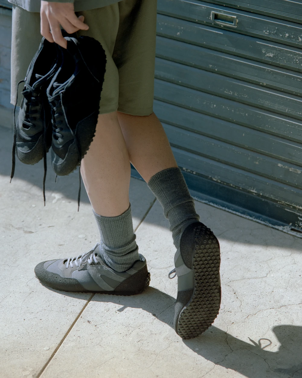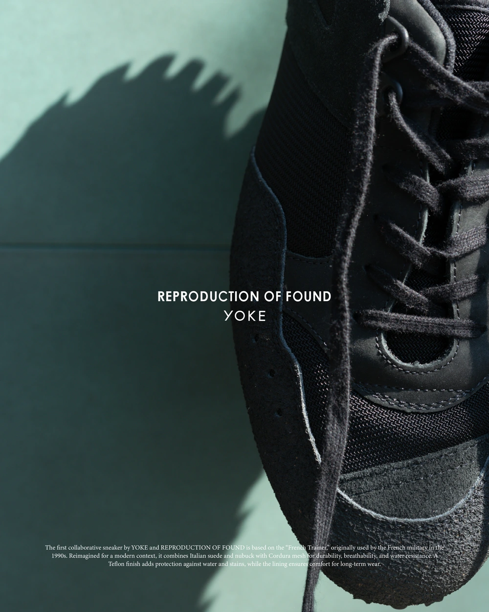 本作は、1990年代にフランス軍でトレーニングシューズとして採用されていた通称“フレンチトレーナー”をベースに、現代的な視点で再構築したモデル。当時の軍用シューズを手掛けていたファクトリーに製作を依頼し、オリジナルの背景を踏襲しながら、<YOKE>のフィルターを通して素材やディテールを再編集している。