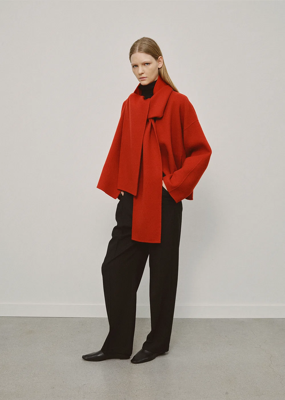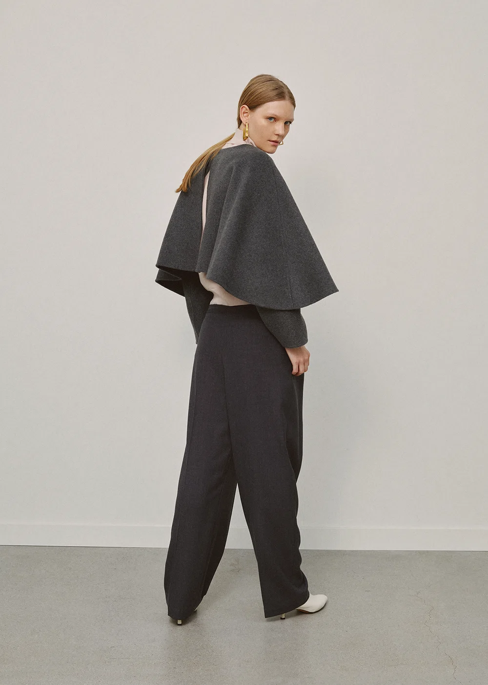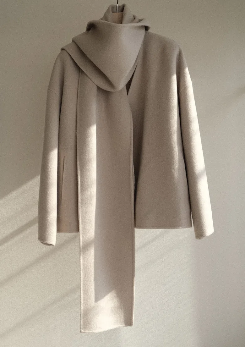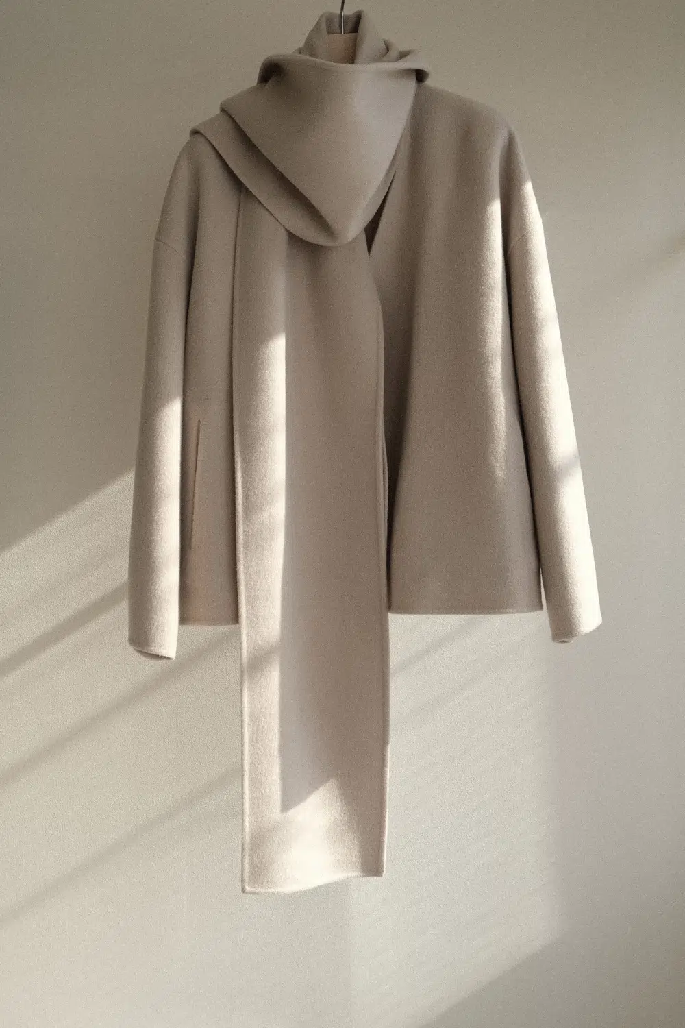 注目は、エクストラファインメリノウールを使用し丁寧にビーバー加工を施した「Extra fine Merino Wool Coat」の別注カラー〈Taupe〉。立体的な丸みのあるシルエットに大判ストールをあしらった、IIROTらしい女性らしさを象徴する一着だ。価格は税込103,400円。