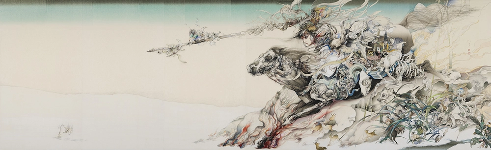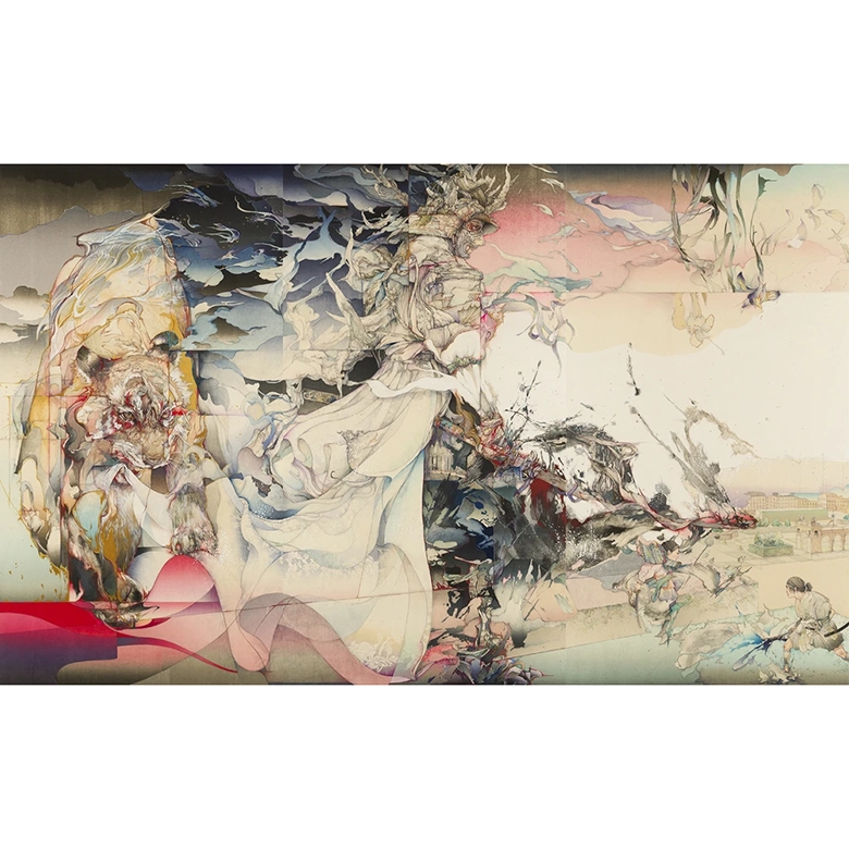 本展の大きな見どころとなるのが、新作《夢幻対峙之図》。2023年制作の《黒雲妖炎龍図》と対をなす作品として構想され、龍と虎が対峙する六曲一双屏風として初公開される。壮麗なスケールの中で、入江のイメージはよりダイナミックに展開される。