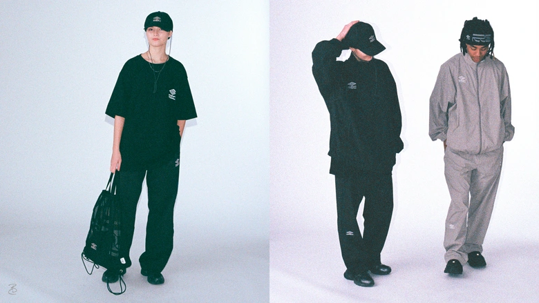 RDC × UMBRO(Tシャツ ¥7,700 / トラックジャケット ¥20,900 / パンツ ¥16,500 / キャップ ¥5,500 / メッシュバッグ ¥7,700 / ヘアバンド ¥4,400)